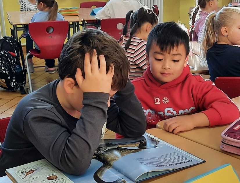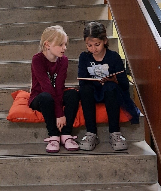Am Donnerstagmorgen stand etwas Besonderes auf dem Stundenplan: Die Klasse 3a besuchte die 1a. Die Drittklässler kamen etwas aufgeregt mit den selbst ausgewählten Büchern in ihr ehemaliges Klassenzimmer. Jeder hatte eine Geschichte vorbereitet, die er einem Schulanfänger vorlas. So entstand ganz schnell eine Lesepatenschaft zwischen den Kindern. Die Erstklässler genossen den Kontakt mit den Großen und lauschten neugierig den schönen Geschichten. Ganz nebenbei wurden sowohl das Vorlesen als auch das Zuhören geübt. Da diese Tandemaktion bei Groß und Klein so gut ankam, wird nächsten Donnerstag ein zweites Treffen stattfindet. Bestimmt können die Jüngeren ihre frisch erworbenen Lesekünste auch bald zeigen.