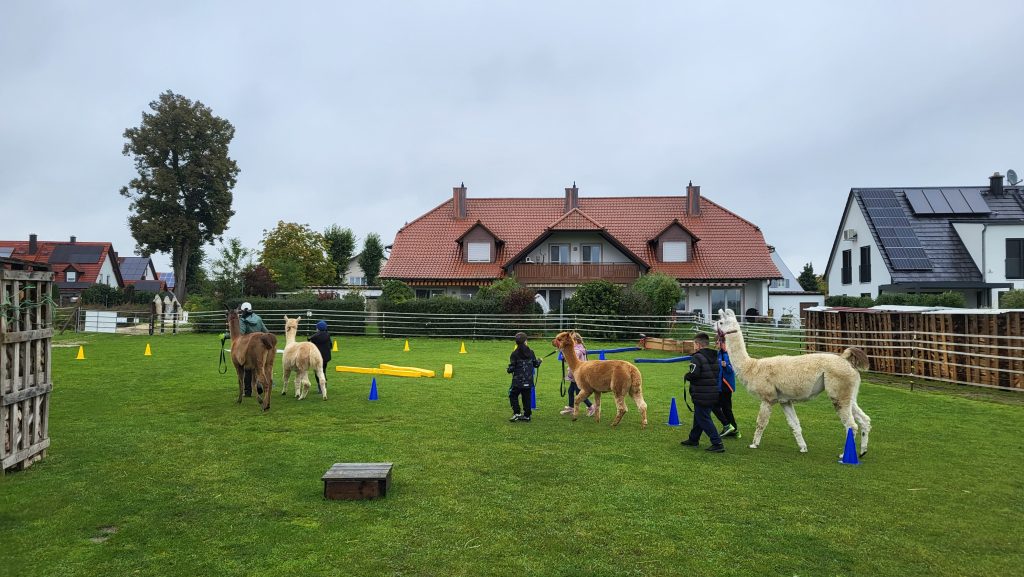 Am Dienstag, den 7. Oktober, sind wir eine Stunde mit dem Bus zur Happy Höcker Farm gefahren. Dort hat uns eine Frau alles erklärt. Als erstes haben wir die Regeln besprochen, wie wir uns den Tieren gegenüber richtig verhalten müssen. Danach hat sie uns die Vierbeiner vorgestellt. Es gab Kamele, Lamas und Alpakas. Wir durften die Lamas und Alpakas durch einen Parcour führen. Am Süßesten fanden wir Flocke und Zilly. Wir haben die Kamele geputzt und Medaillen ausgemalt. Am Ende haben wir noch mit dem Hund Susi gespielt und sie gestreichelt. Insgesamt hatten wir einen wunderschönen Ausflug.