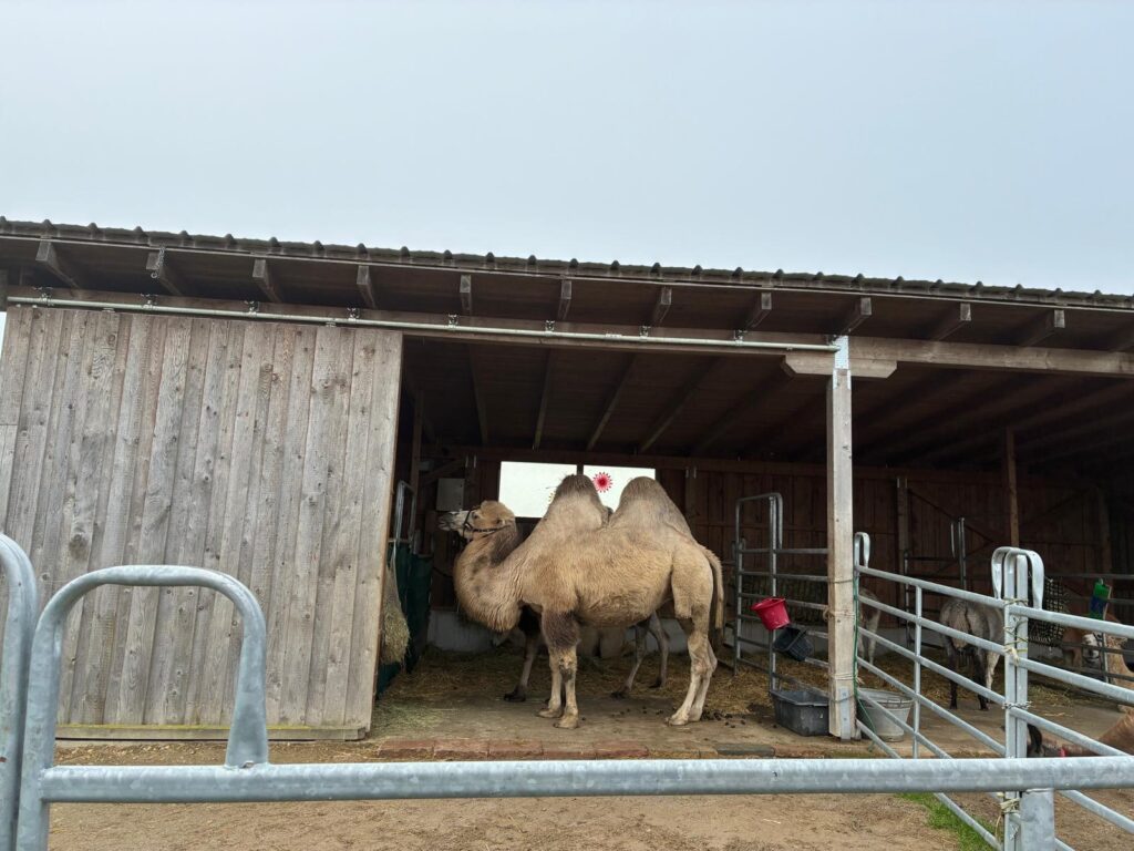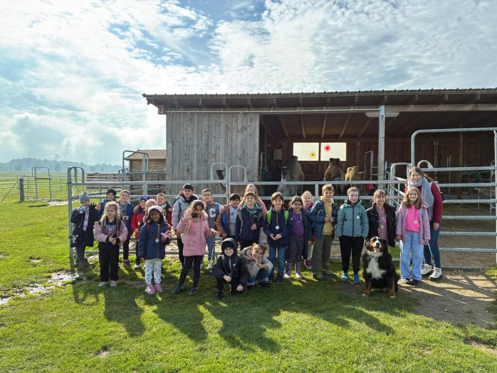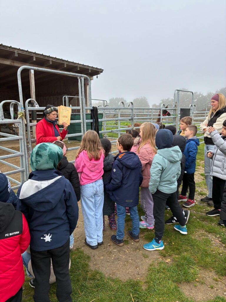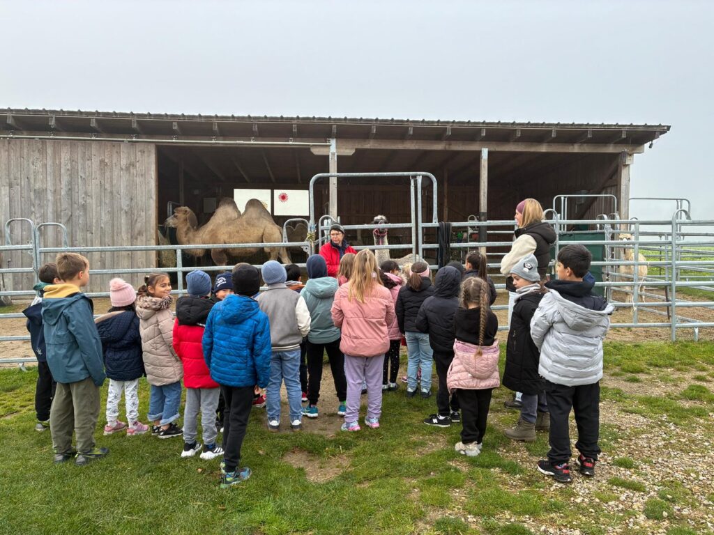 Am 08.10.2025 ging es für die 2b zum ersten Ausflug des Jahres. Mit dem Bus starte die Klasse zur Happy Höcker Farm. Nicht nur von Frau Schmidt wurden wir herzlich empfangen, sondern auch von den Kamelen, Lamas und Alpakas. Sogar ein süßer Hund war dabei. Gemeinsam lernten alle die Regeln, wie man mit den Tieren richtig umgeht und dann wurde schon selbst losgelegt. Jedes Kind durfte striegeln, Medaillen ausmalen und die Tiere durch eine Parcours führen. Das war ein ganz besonderer Tag für die 2b.