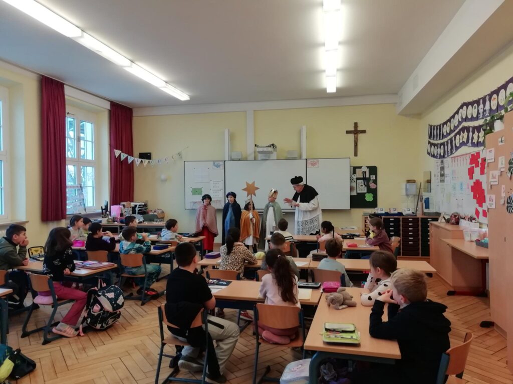 Die Sternsingerkinder der Pfarrei besuchten am ersten Schultag nach den Weihnachtsferien mit Pater Lorenz jede Klasse unserer Schule und sprachen ihre guten Neujahrswünsche für unser Schulhaus und jedes Schulkind aus.