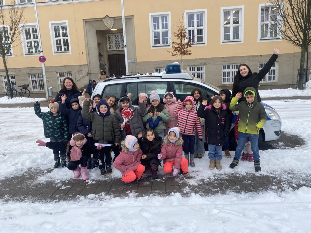Wie laufe ich richtig über die Straße? Wie verhalte ich mich im Bus? Diese und weitere Fragen wurden am 26.1. und 27.1.2026 in den ersten Klassen mit Hilfe der Polizei Ingolstadt geklärt und exemplarisch behandelt. Nach einer Theorieeinheit folgte das Highlight der Aufklärungsstunde. Eine im wahrsten Sinne des Wortes rasante Busfahrt stand den Erstklässlern bevor. Dabei konnten die Kinder am eigenen Körper spüren, wie wichtig es ist, sich im Bus festzuhalten und den Busfahrer nicht zu stören. Mit einer anschließenden „Karussellfahrt“ im Kreisverkehr ging es wieder zurück zur Schule.